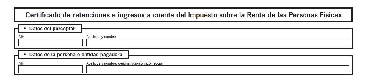 Incluimos, en la parte de arriba, los datos (NIF y nombre completo) del retenido y en la parte inferior los del retenedor que emite el certificado.