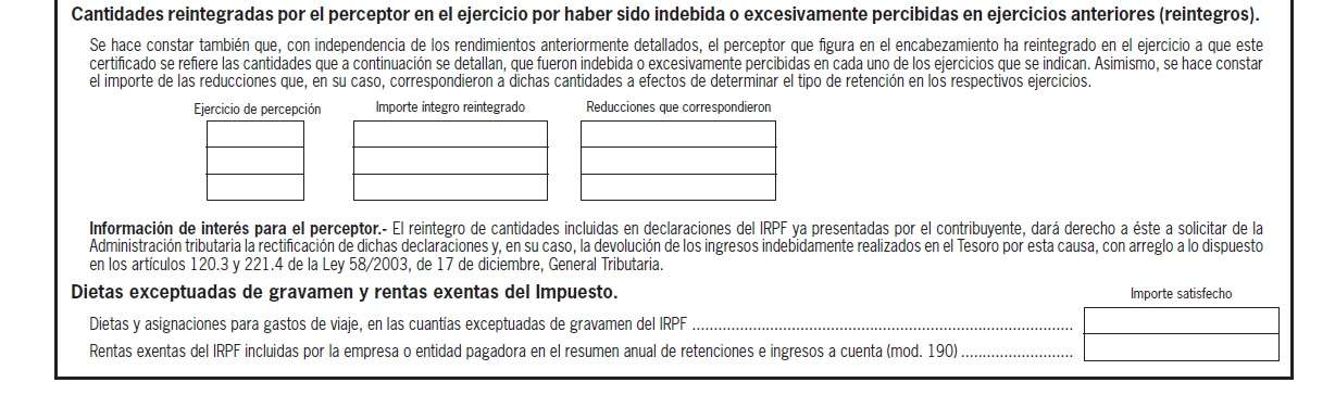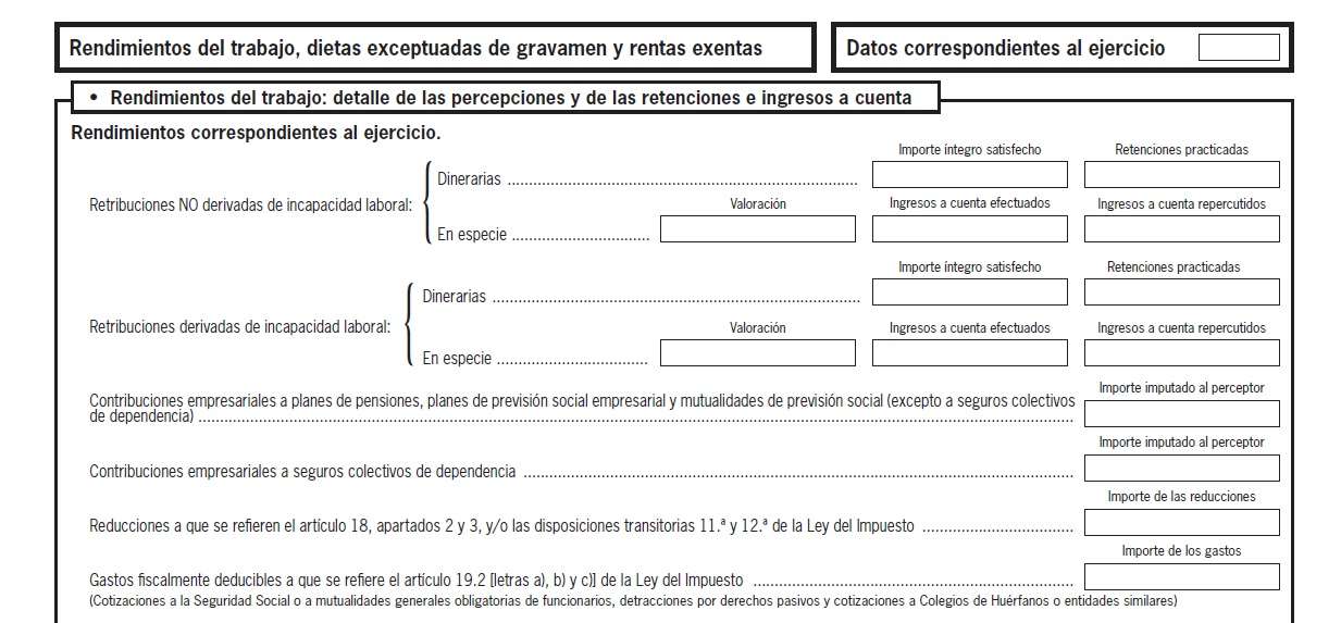 En el siguiente apartado se declararán las cantidades que no están sujetas a gravamen del IRPF, tanto las dietas (que son compensación por gastos del trabajo y no ingresos del trabajador) y otros ingresos exentos de IRPF.
