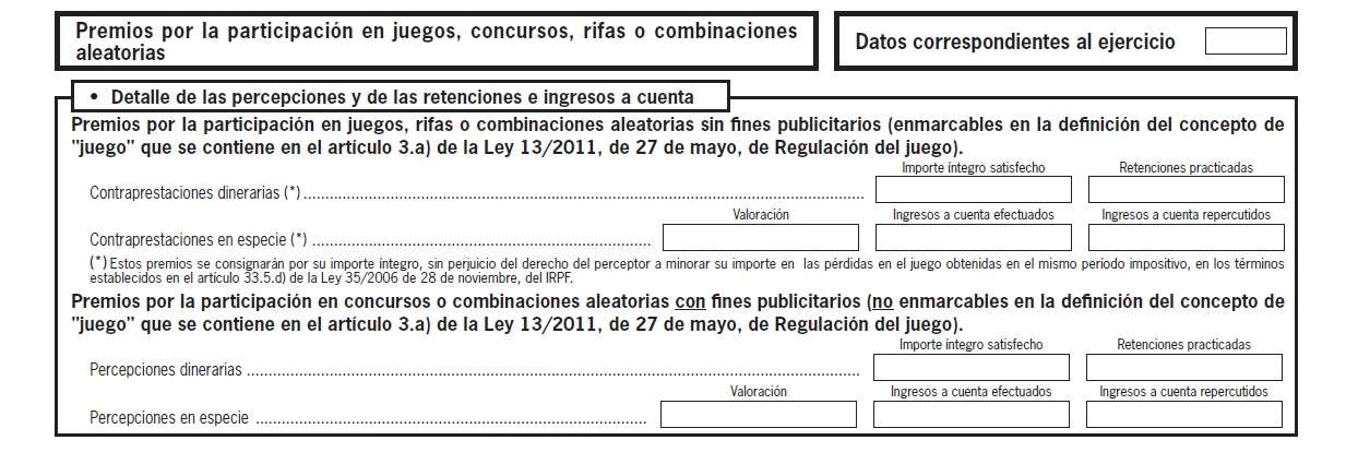 El organizador y, por lo tanto, pagador de premios por sorteos y rifas incluirá aquí lo que ha pagado al retenido y la retención que le ha hecho incluyendo, como en los demás casos, detalle de pagos en dinero o en especie (con su valoración) y discriminando si los sorteos son no publicitarios o publicitarios.