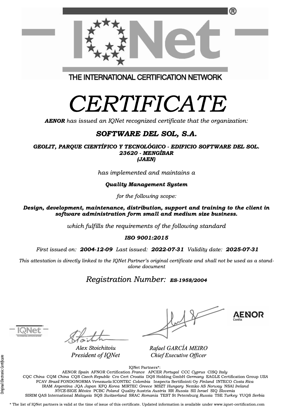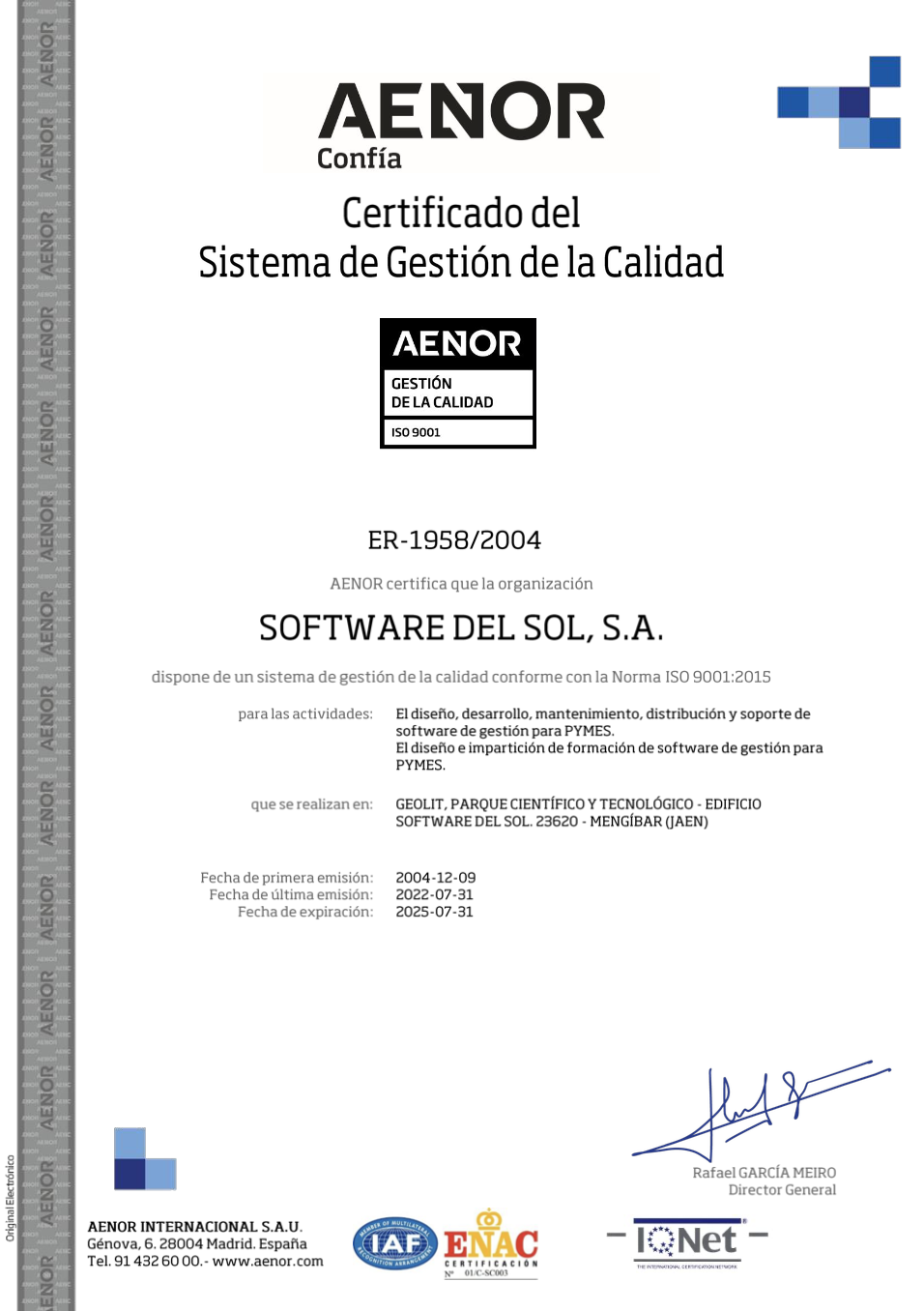 En 2004 implantamos nuestro Sistema de Gestión de la Calidad, que fue certificado por la empresa AENOR, y desde entonces lo hemos renovado hasta la fecha.